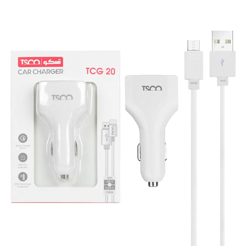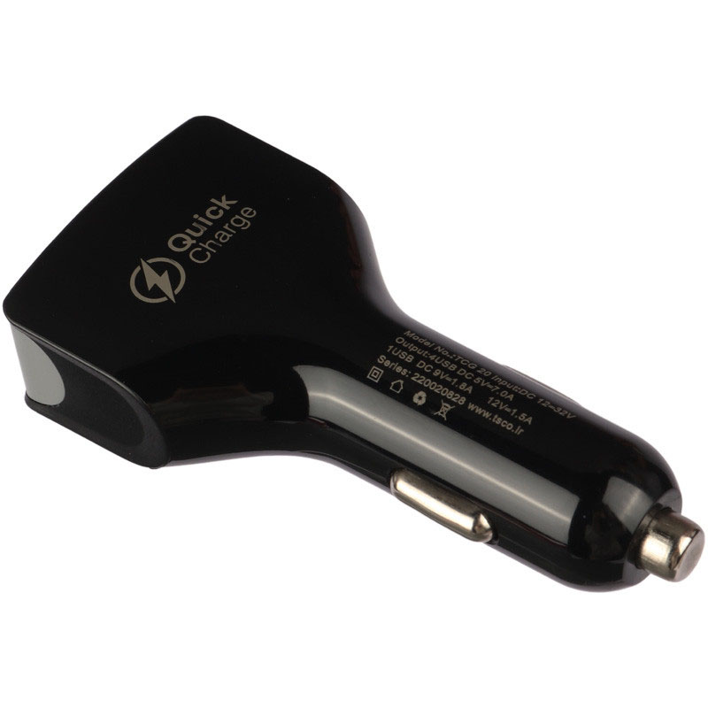 TCG 20 محصولی از برند تسکو طولي حدود 9 سانتيمتر دارد و از جنس پلاستيک است. اين شارژر فندکي داراي 4 درگاه خروجي USB مي باشد که شدت جريان خروجي آنها به 7.0 آمپر مي رسد و قابليت شارژ همزمان 4 دستگاه را دارد.