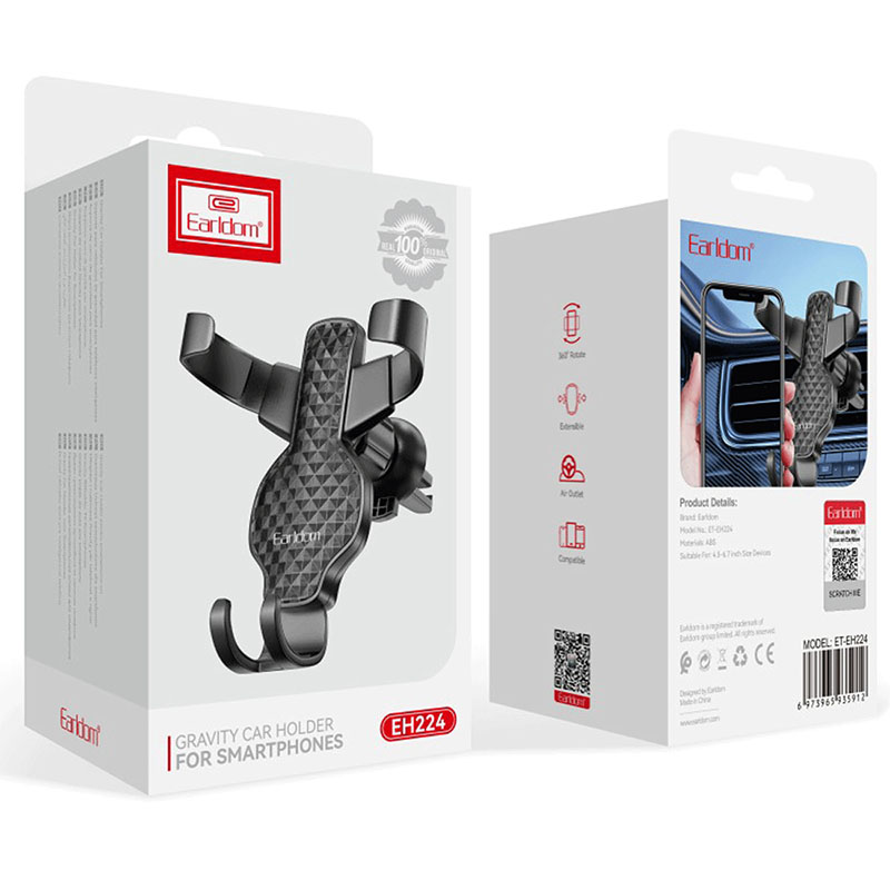 هولدر موبایل Earldom مدل EH224 یک پایه نگهدارنده گوشی جهت استفاده در اتومبیل و وسایل نقلیه که بوسیله پایه مخصوص به دریچه کولر براحتی متصل می شود.هولدر موبایل Earldom مدل EH224 در مناسب برای 99٪ از وسایل نقلیه با کارایی متفاوت، پایداری بالا و با دوام، عملکرد یک دست قابل حمل مناسب برای انواع گوشیهای هوشمند تشکیل شده از یک پایه نگهدارنده محکم و قدرتمند که ساخته شده از یک گیره سیلیکونی مناسب برای نصب بر سطوح باریک در جلوی ماشین مثل بخاری است و میتواند قابلیت چرخش حول محور عمود بر پایه نگهدارنده را دارد. برای قرار گیری و جاگیری موبایل درون هلدر که توسط دو گیره محکم و فنر دار که باز شده و بدلیل روکش نرم در عین حال محکم به گوشی شما آسیب نزده در عین حال آن را محکم و ثابت نگه دارد. از بارزترین کاربرد این هولدر نگه داشتن گوشی در هنگام رانندگی، بدون نگه داشتن آن با دست کارهایی از قبیل استفاده از مکان یاب GPS موبایل یا گوش دادن به موسیقی و … بدون نگرانی از افتادن یا تکان خوردن گوشی با خیال راحت به رانندگی خود ادامه داد؛ البته بهتر است در هنگام رانندگی از تلفن همراه خود تا حد امکان استفاده نکنید.