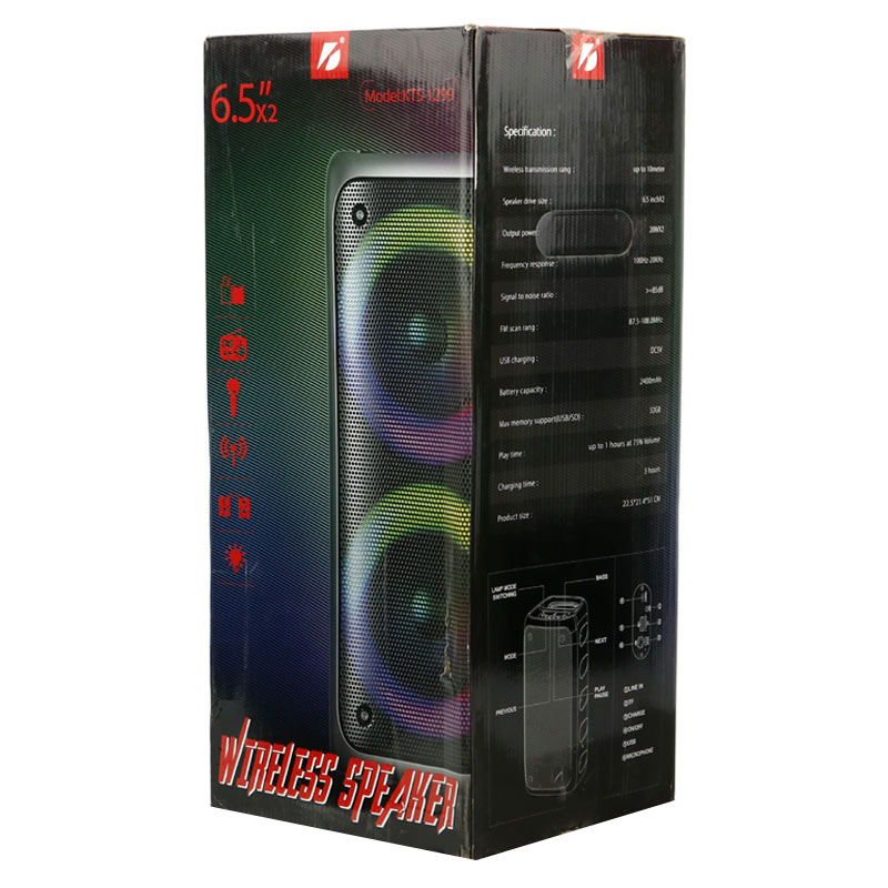 اسپیکر بلوتوث قابل حمل KTS با توان خروجی 40 وات و ظاهر شیک و زیبا میتواند انتخاب خوبی برای گوش دادن و لذت بردن از موزیک دلخواهتان باشد. این اسپیکر دارای دو باند 6.5 اینچی و دارای رقص نور RGB می باشد که هنگام پخش موزیک زیبایی چندانی به اسپیکر میدهد. پشتیبانی از کارت حافظه و فلش مموری ، بلوتوث ، ورودی AUX و قابلیت اتصال میکروفن از ویژگی های این اسپیکر قدرتمند می باشد .
